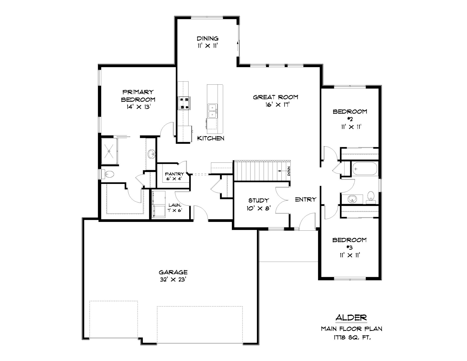 The Alder is designed for comfortable, everyday living with an open layout and thoughtful spaces throughout. The main living area brings together the great room, kitchen, and dining space, creating a welcoming place to gather, relax, and entertain. The kitchen features a large island and walk-in pantry for added convenience. The private primary suite is set apart from the other bedrooms and includes a spacious bath and closet. Two additional bedrooms and a full bath provide flexibility for family or guests, while a dedicated study near the entry offers the perfect space for working from home or staying organized. With main floor laundry, plenty of storage, and a large attached garage, the Alder combines functionality with a warm, inviting feel.