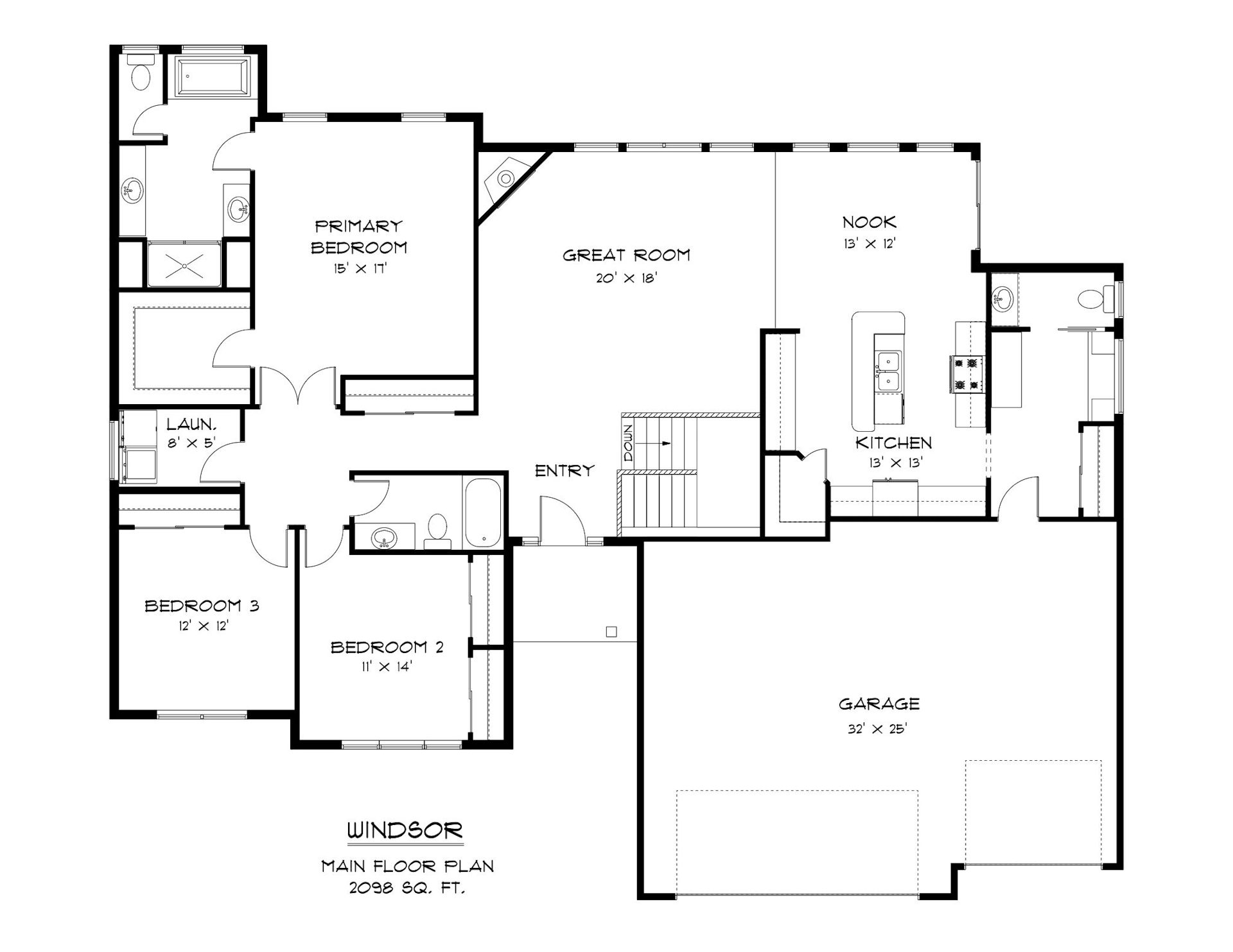 The Windsor is an open-concept ranch home with a three-stall garage and a mudroom entrance. The kitchen includes a corner pantry and flows into the living space, while the master suite features dual vanities and a large walk-in closet. The layout places the laundry near all bedrooms for efficiency.